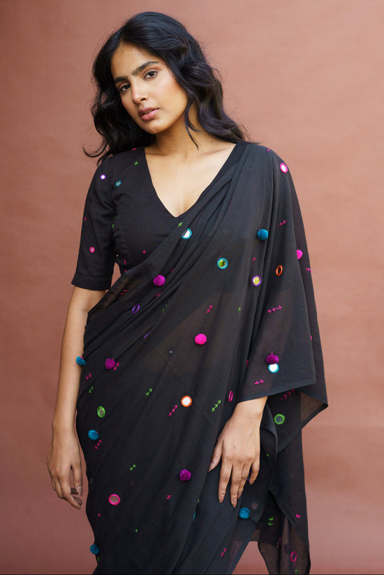 This beautiful Black saree in Mulmul features intricate mirror work motifs inspired by the Rabari embroidery. It is finished with a tassel bunch on the ends. This saree comes with a Black blouse piece with mirror embroidery