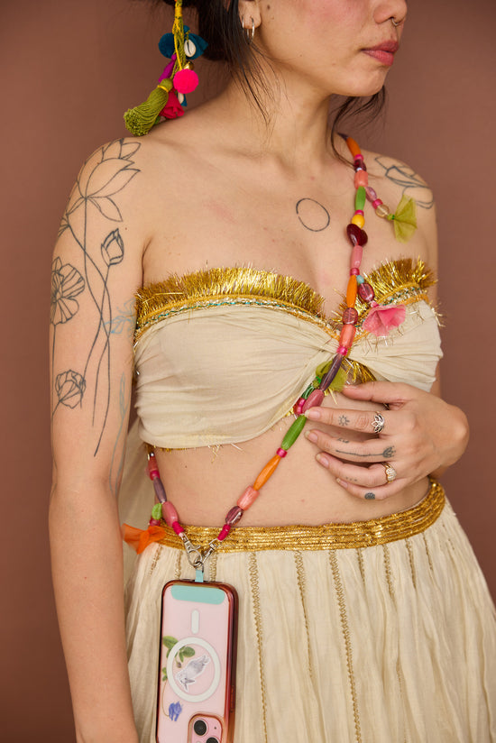 A vibrant handmade mobile chain featuring colourful beads, fabric accents, and playful tassel details. Perfect for adding a boho-festive touch while keeping your phone stylishly close.