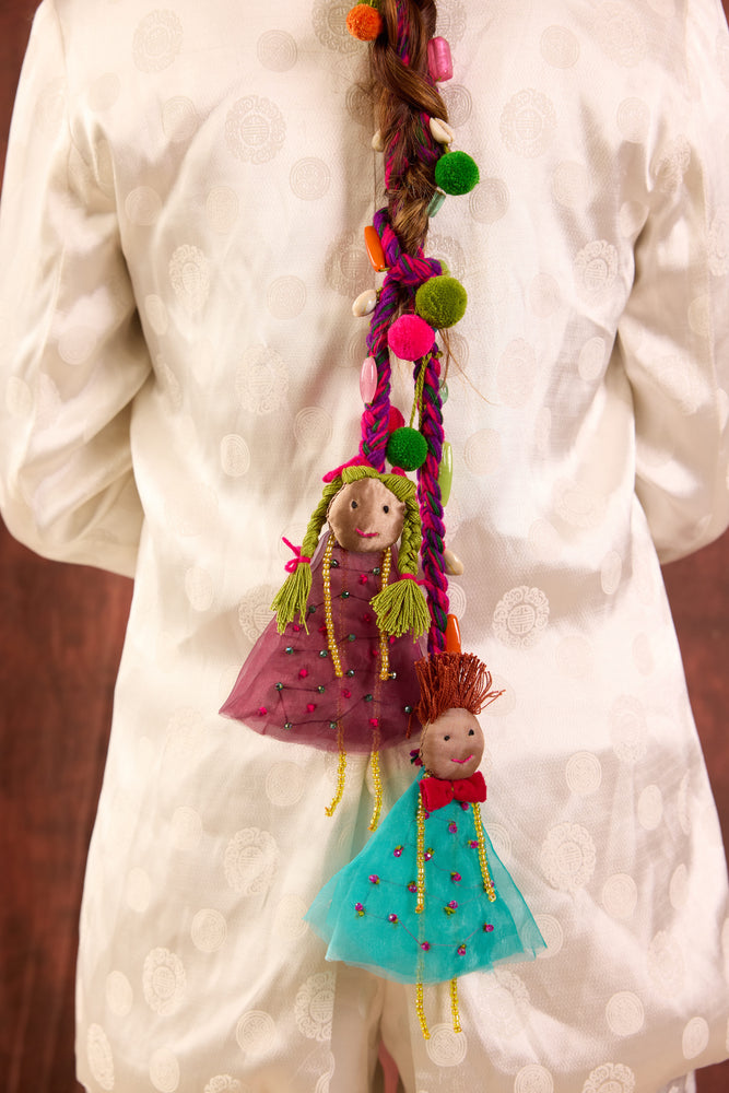 Embrace the beauty of craftsmanship with our Hand-embroidered Doll Parandi, where intricate embroidery meets playful charm. Adorned with colorful tassels, poms, cowries and vibrant ceramic beads, this unique accessory is a perfect blend of cultural heritage and bohemian flair.