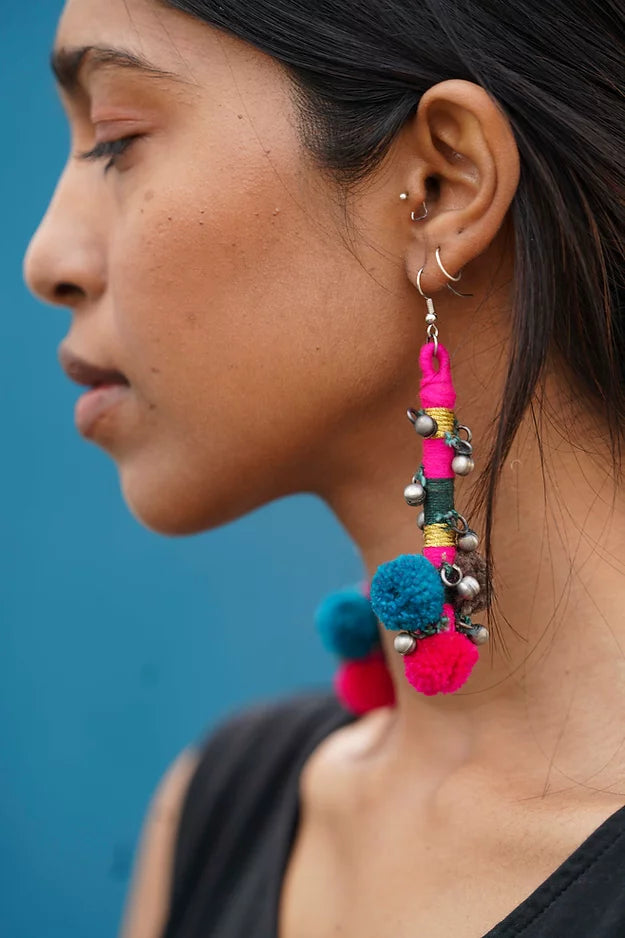 These cute cylindrical danglers combined with pom poms and ghungroos are the cutest pair of earrings you'll own.